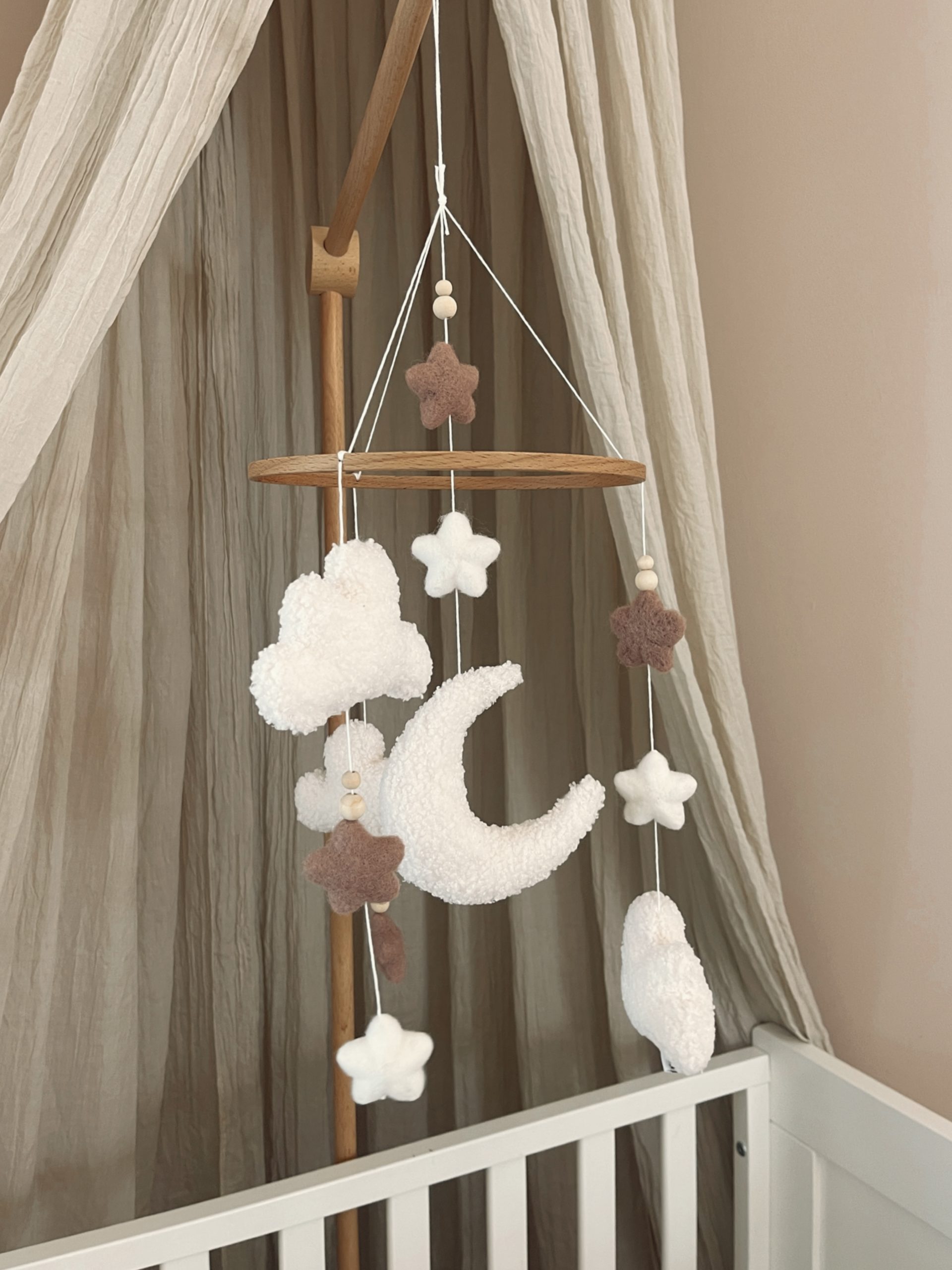 Creëer een dromerige en rustgevende sfeer voor je kleintje met onze prachtige baby mobiel. Deze fluffy clouds mobiel is voorzien van zachte, fluffy bouclé wolken, een maan en kleine sterretjes allemaal in zachte en neutrale kleuren. Alle figuurtjes hangen stevig aan een houten ring met duurzame touwen.