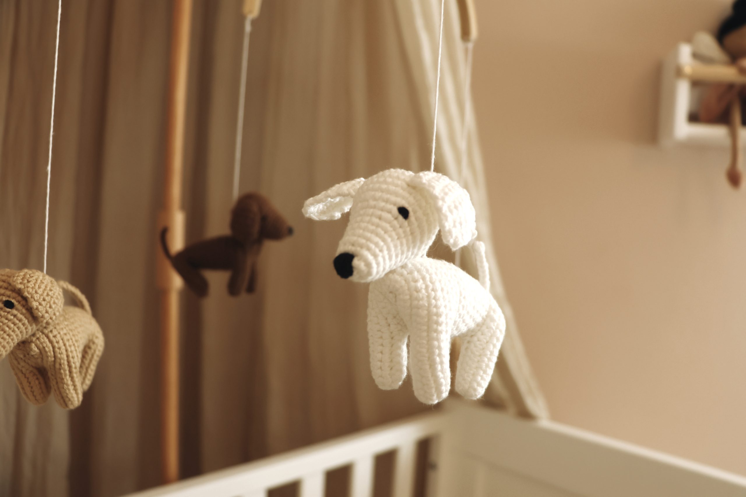 Imagine your little one peacefully falling asleep, enchanted by the soft twirl of cuddly and cute toys hanging from their wooden mobile above the bed. Our lovingly handmade Dog baby mobile is designed to create a calm bedtime atmosphere. The soft movements will snooze your baby towards a deep and healthy sleep.
