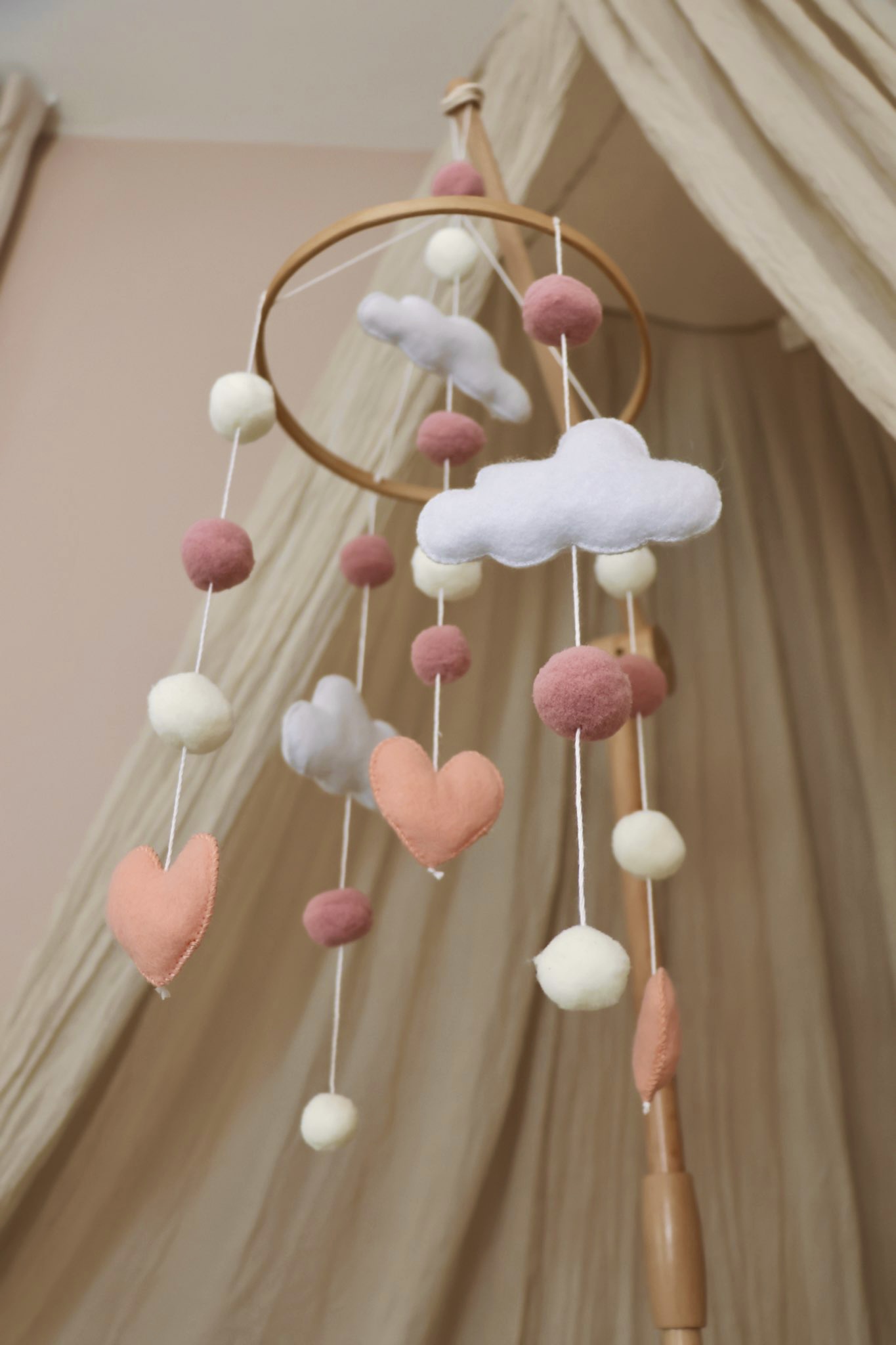 Introducing our charming Baby Mobile adorned with soft clouds, dainty pompoms, and adorable little hearts dangling from a wooden ring! This exquisitely crafted mobile is not only a delightful addition to any nursery but also a source of tranquility for your little one.